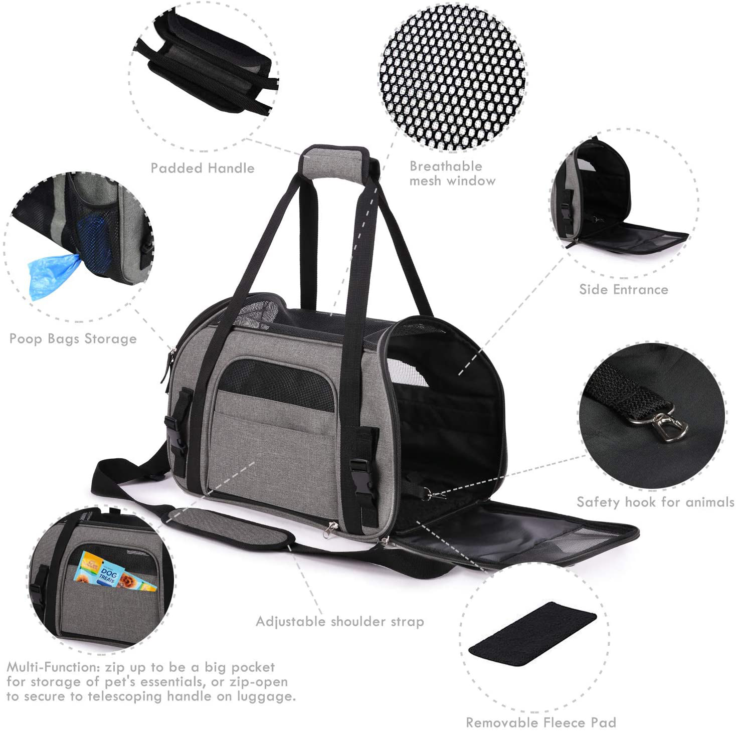 * A small zipper opening at the top of the carrier that allows you to quickly unzip and reach into the bag to access your pet