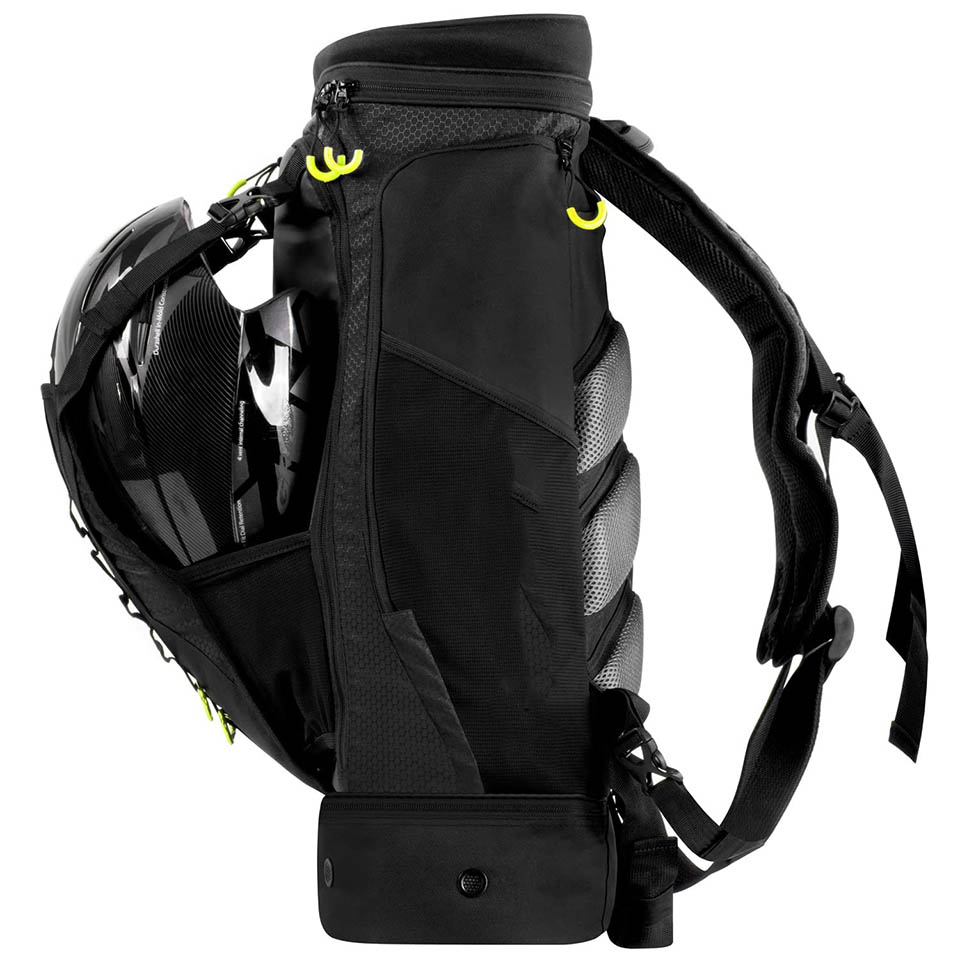 STAY ORGANIZED: Customizable main compartment accommodates various shapes and sizes. Adjustable front helmet pocket. Attached 2-pc. carabiner and front loops to hang accessories.