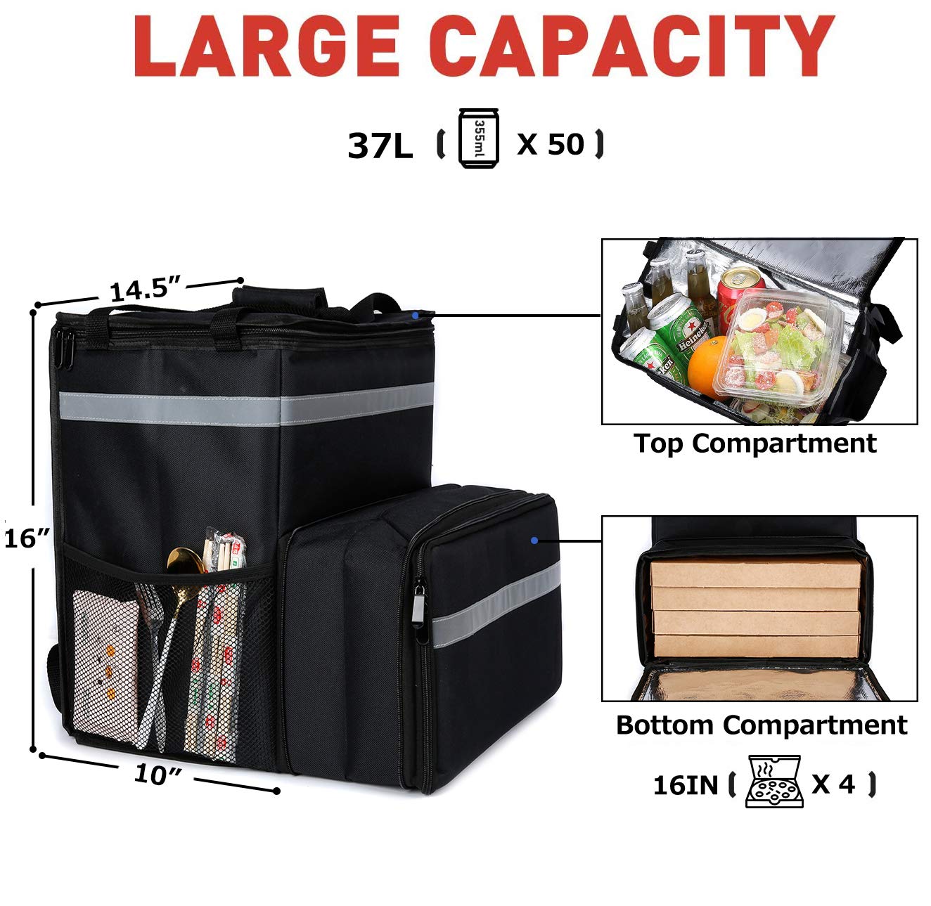 * 【LARGE CAPACITY】- The food delivery backpack is 16”Lx10”Wx14.5”H, spacious enough to fit most food packages like sandwiches, beers, snacks, etc. The bottom compartment can stack 1-4pcs 14” pizza boxes. Perfect for Uber Eats, Grubhub, DoorDash and Postmates or for camping, BBQs and shopping.