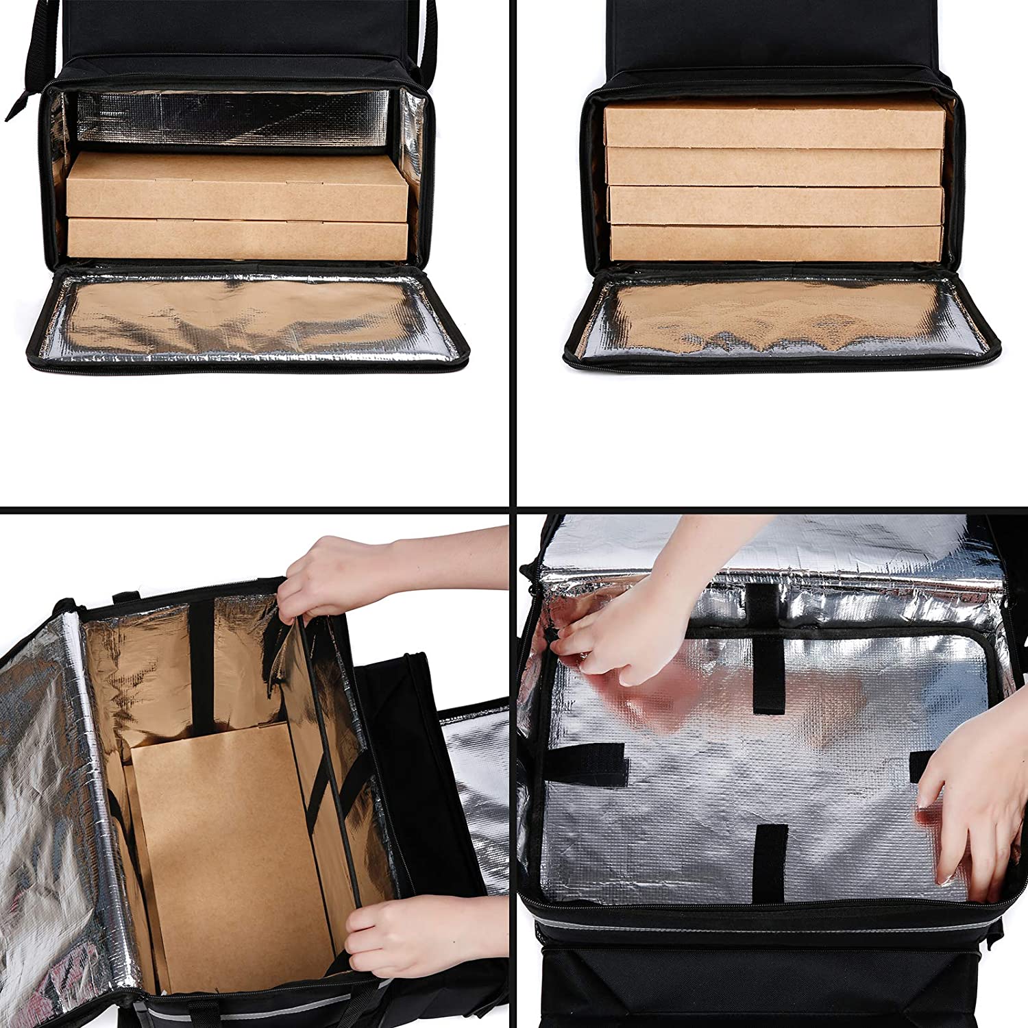 * 【3 DIVIDERS INCLUDED】- Our thermal food delivery backpack comes with 3 adjustable dividers which can be put anywhere on the interior Velcro rail to create the main compartment into 3 rooms, you can customize it according to your needs. * 【QUALITY MATERIAL】- The exterior of our insulated backpack is made of heavy-duty polyester material. Double insulation PE foam and aluminum foil interior keeps hot foods hot and cold foods cold for longer!
