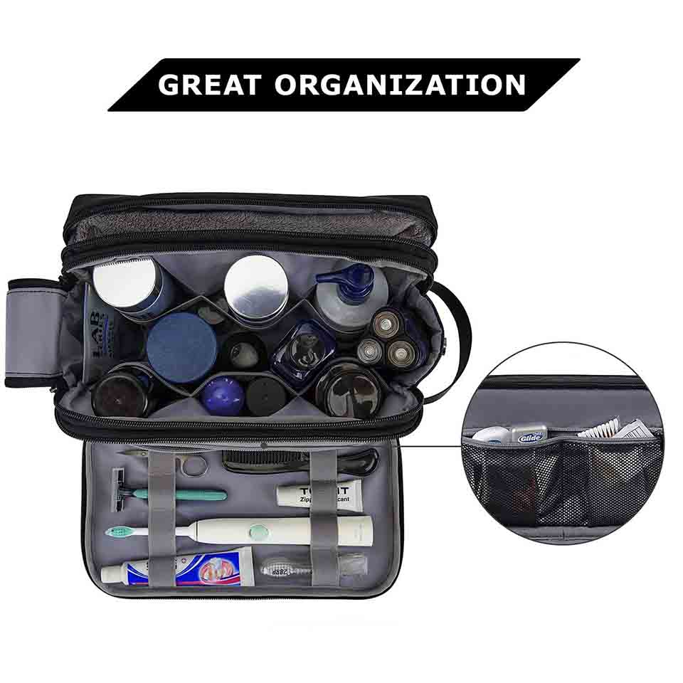 * Large capacity- Spacious main compartment with elastic straps hold bottles upright. Multiple pockets inside, can hold all your toiletries and shaving supplies organized* Separate compartment- The front waterproof pocket can keep the wet/dry items separated. The back panel can be lay them flat,easily organize your items * Double zipper design- Features dual zippered opening, making it quickly reach into the main compartment. Simply pull on the connected zip puller for full exposure * Occassion- Suitable for both home and travel use. Unique design allows you to get a toiletry bag, shaving kit, and makeup bag/cosmetic bag all in one |