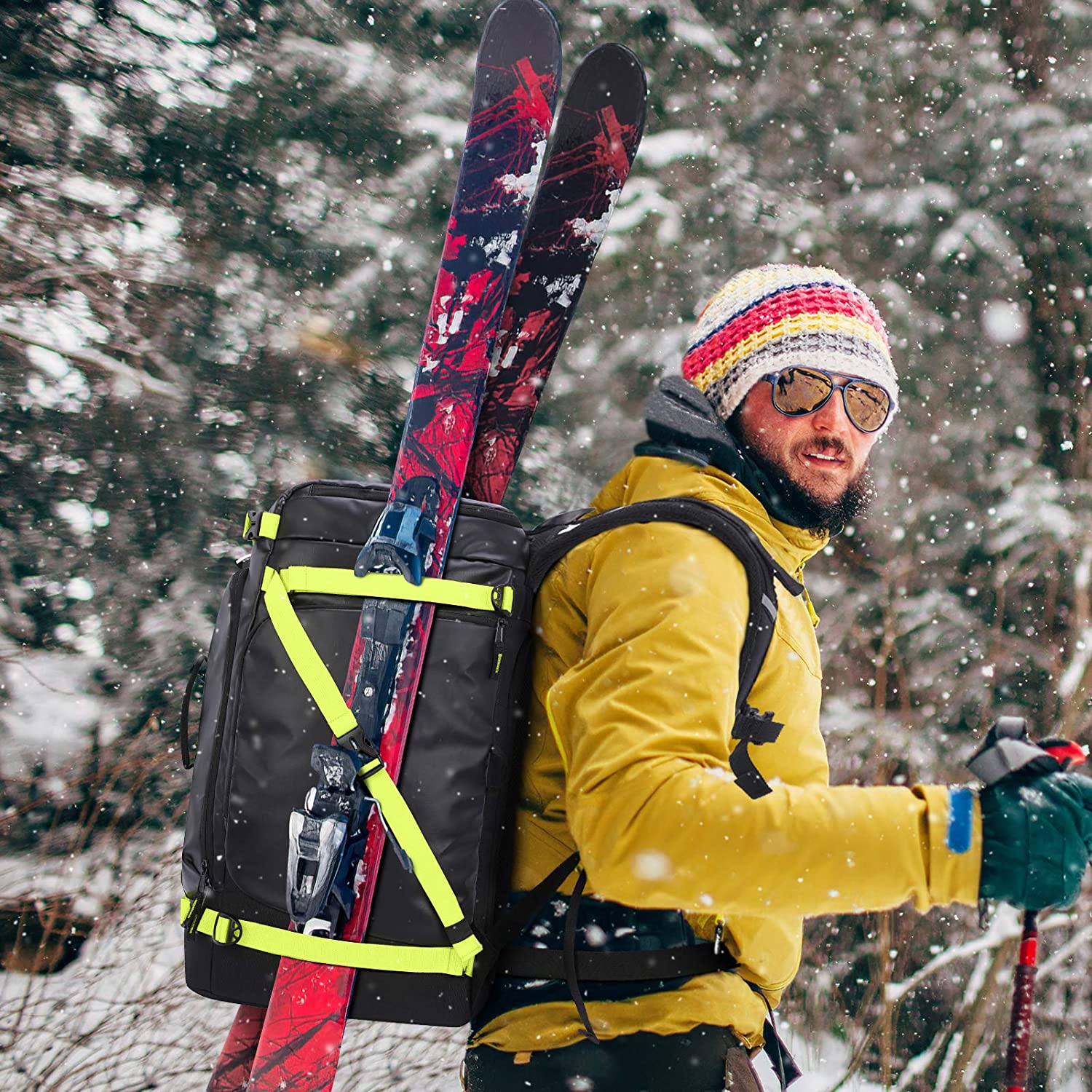* INDIVIDUAL COMPARTMENT: This ski boot bag give you the ultimate protection for your gear. It measures in at 21 x 13 x 14 inches, and is capable of storing men’s boots up to size 13. Five individual compartments and some pockets will stay your gear organized. Easily attach skis and snowboard by using external adjustable webbing. Easy to change boots in any place and keep your feet dry by flipping down back-panel door for using as a standing mat.