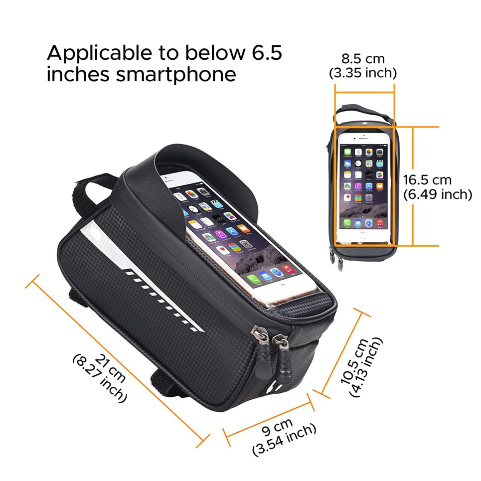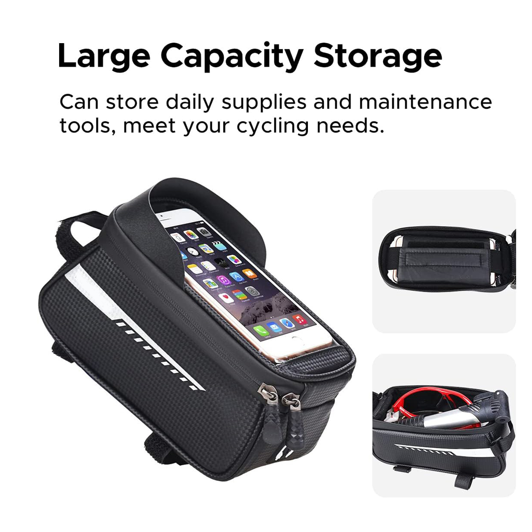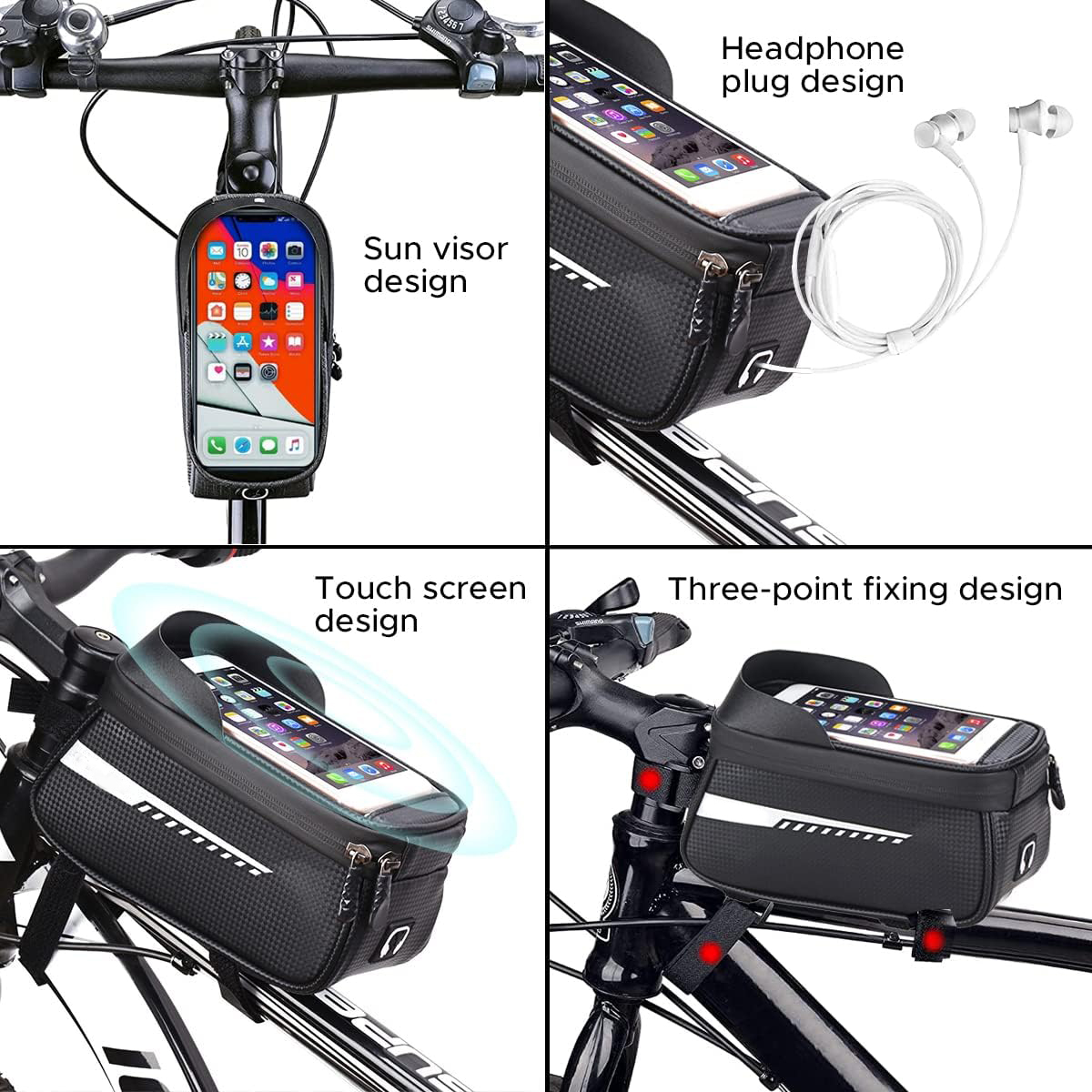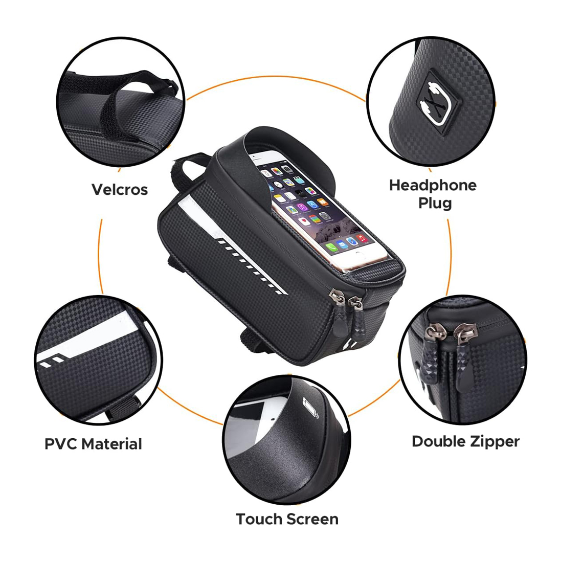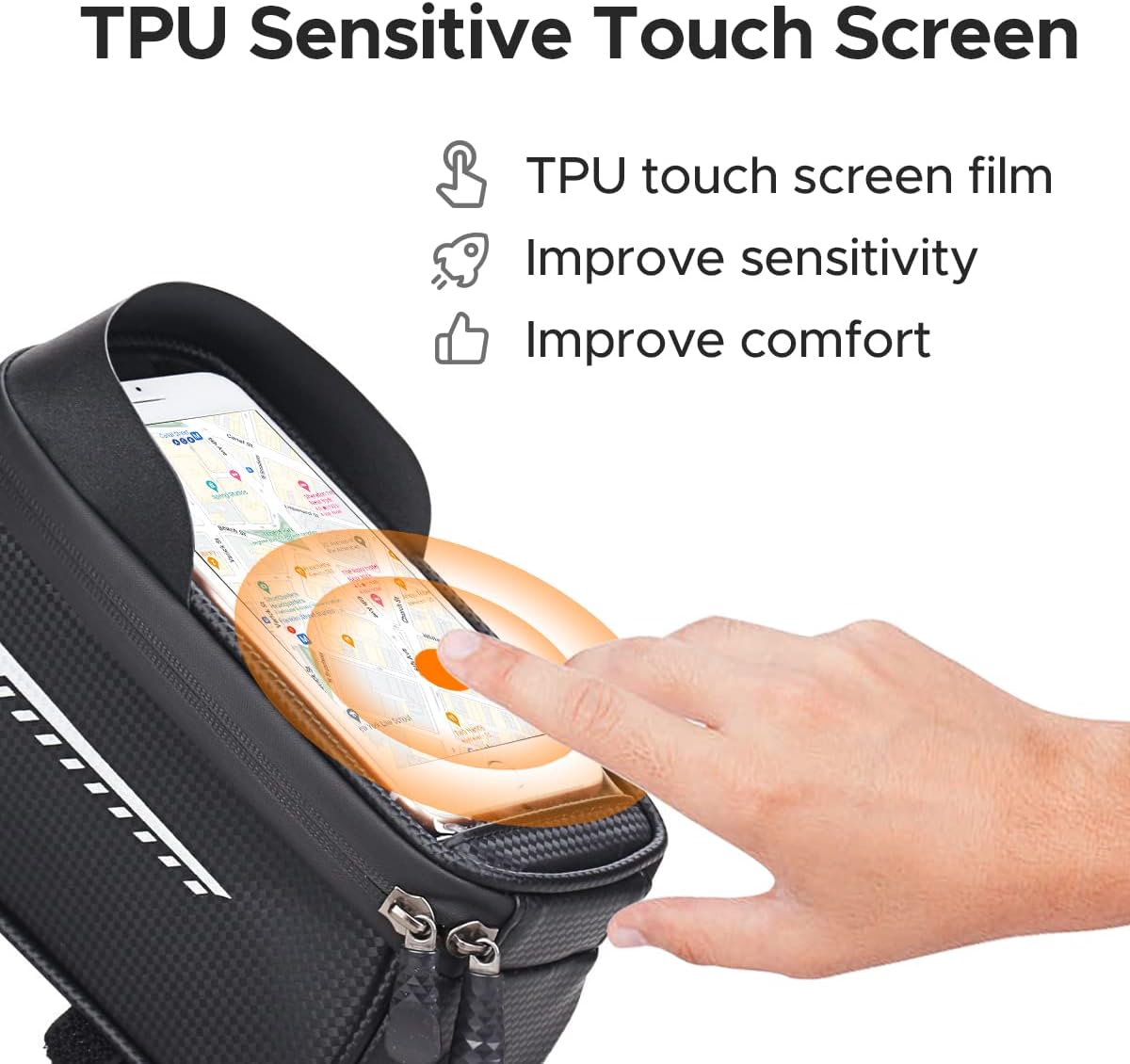 | Description | Constructing from high-quality PVC material with sealed double zippers to prevent water ingress, features a sun visor for rainy days. The 0.25mm TPU film touch screen on the bike frame bag is highly sensitive and clear, allowing easy access to your phone's screen and map viewing during cycling, with the added benefit of a useful sun visor for inclement weather. The humanized design includes a concealed earphone hole for music and calls while cycling. With sufficient capacity for daily riding essentials, such as a cell phone, sunglasses, power bank, gloves, mini pump, keys, and wallet, the bag also offers easy installation and removal with 3 adjustable Velcro fasteners suitable for most bikes, providing both convenience and durability. |