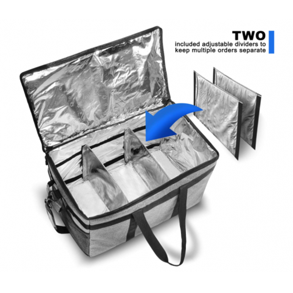1.PREMIUM QUALITY BAG- Our insulated bags are made with high quality polyester fabric, extra thick PE foam insulation,aluminum foil liner, and the highest end YKK zippers to ensure a long lasting, sturdy bag that keeps your food hot OR cold longer! 2.VERSATILE BAG FOR MANY USES - This bag is perfect for food delivery services as well as restaurants and professional caterers. Keep one in your car for going to the grocery store or use for picnics! 3.XXL EXTRA LARGE SUPER SPACIOUS SIZE - 23"x14"x15"Caterers: Plenty of room to carry up to 4 full size steam table pans or a combination of full size and smaller pans. 4.Food delivery: Use the TWO INCLUDED DIVIDERS to split up multiple delivery orders!