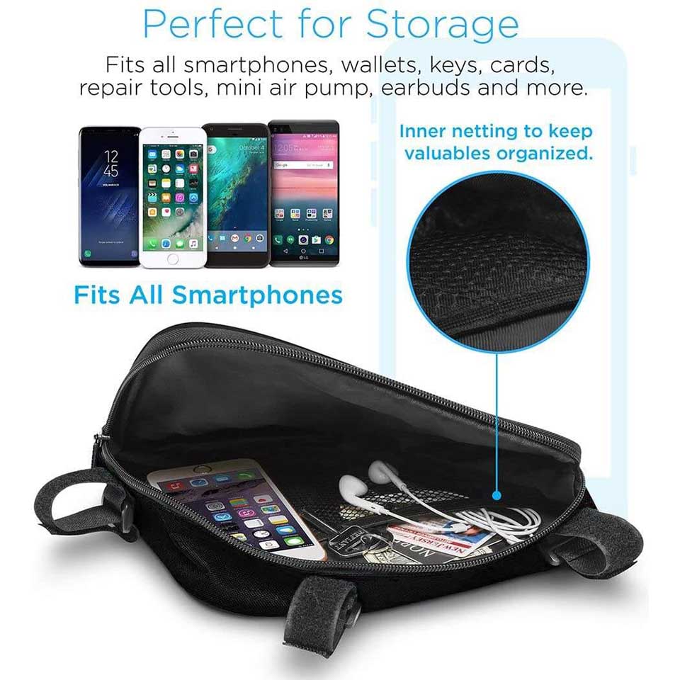 * Big zippered opening mouth design for easy access, with durable zipper closure, Slim body design with high capacity to minimize the wind resistance * Water and Weather-resistant strong and durable polyester material helps protect stored items * Fits most essentials like smartphones, wallet, keys, small bike pump, cable lock, repair tools etc. (not included) |