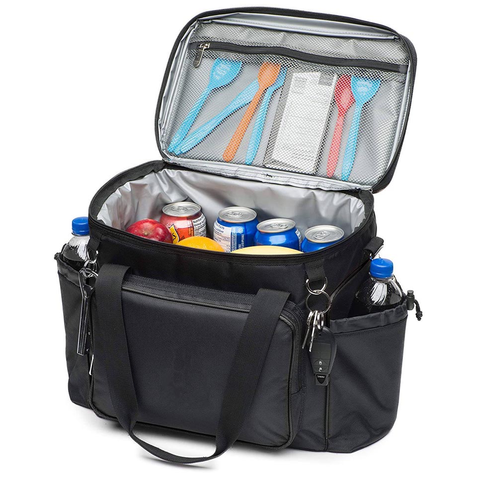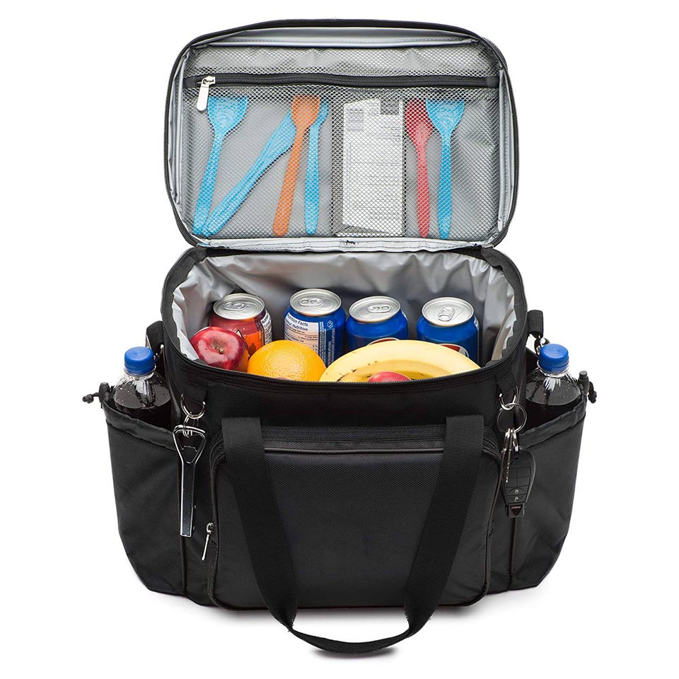 Two Separate insulated compartments. Front zippered pocket and two side mesh pockets INTENDED USE: Cooler, Lunch Cooler, Soda Can Insulated Holder, Picnic Cooler, Lunch Pail This cooler bag is perfect for a daily lunch pail or picnic outing for 2 Comes with Top insulated compartment and side mesh pockets to hold whatever you need. Comes with a carry strap for easy carrying to and from work.