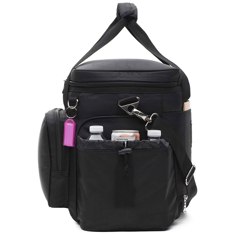 stainless steel clips. 1680D is the strongest material compared to commonly used 600D or other lower grade fabric for lunch bags, coolers & lunch boxes. * MULTIPLE POCKETS - LOTS OF ROOM: Two large, wide and deep side pockets (8 x 9 Inches), each pocket can hold multiple bottles. Front fully insulated 11x8 inches pocket can be used for sandwiches, containers, gadgets etc. 11 inch wide trolley pass through for luggage handles at the back. Mesh pocket inside the lid. * LONG LASTING COOLING: Cooler Lunch bag is thickly insulated with EPE foam and thick grey peva liner to maximize cooling. To increase cooling further use ice packs made for cooler bags. Cooler is not intended to put open ice, open liquid or homemade plastic ice packs as sharp edges of ice can damage the liner. |