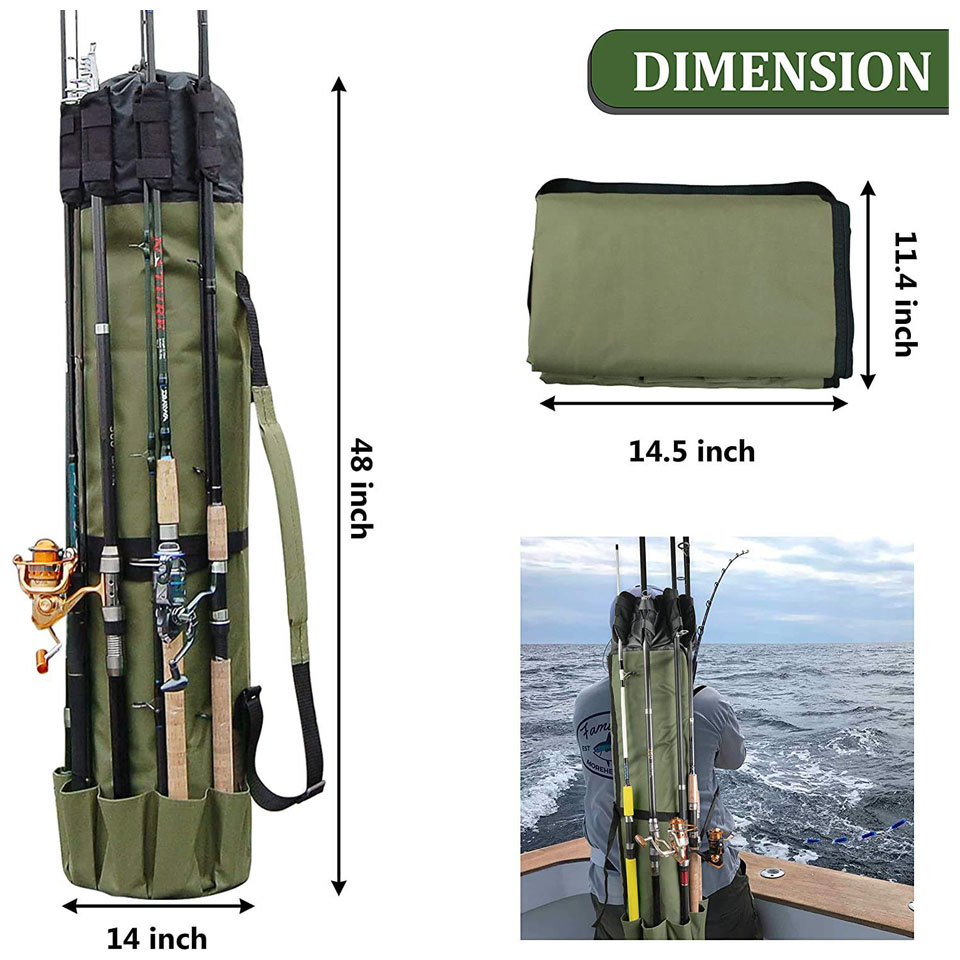 * The fishing rod bag is super large capacity. The inside of bag can store many fishing gear such as a bucket, fishing chair, tackle and equipment all in one. The side pocket also can hold a lot of fishing tackle. approx. 48"L x 14"D * Fishing pole carrier bag made of heavy duty 600D Oxford fabric material, sturdy and durable, waterproof material on the reverse side, abrasion resistance * Made by lightweight cloth. Can be used it as hand carry or shoulder carry. Easy to carry * The fishing pole bag with holder is a absolute needed bag for the person who loves to fish, there is enough storage for everything you need in a fishing trip. Perfect gift for Men |