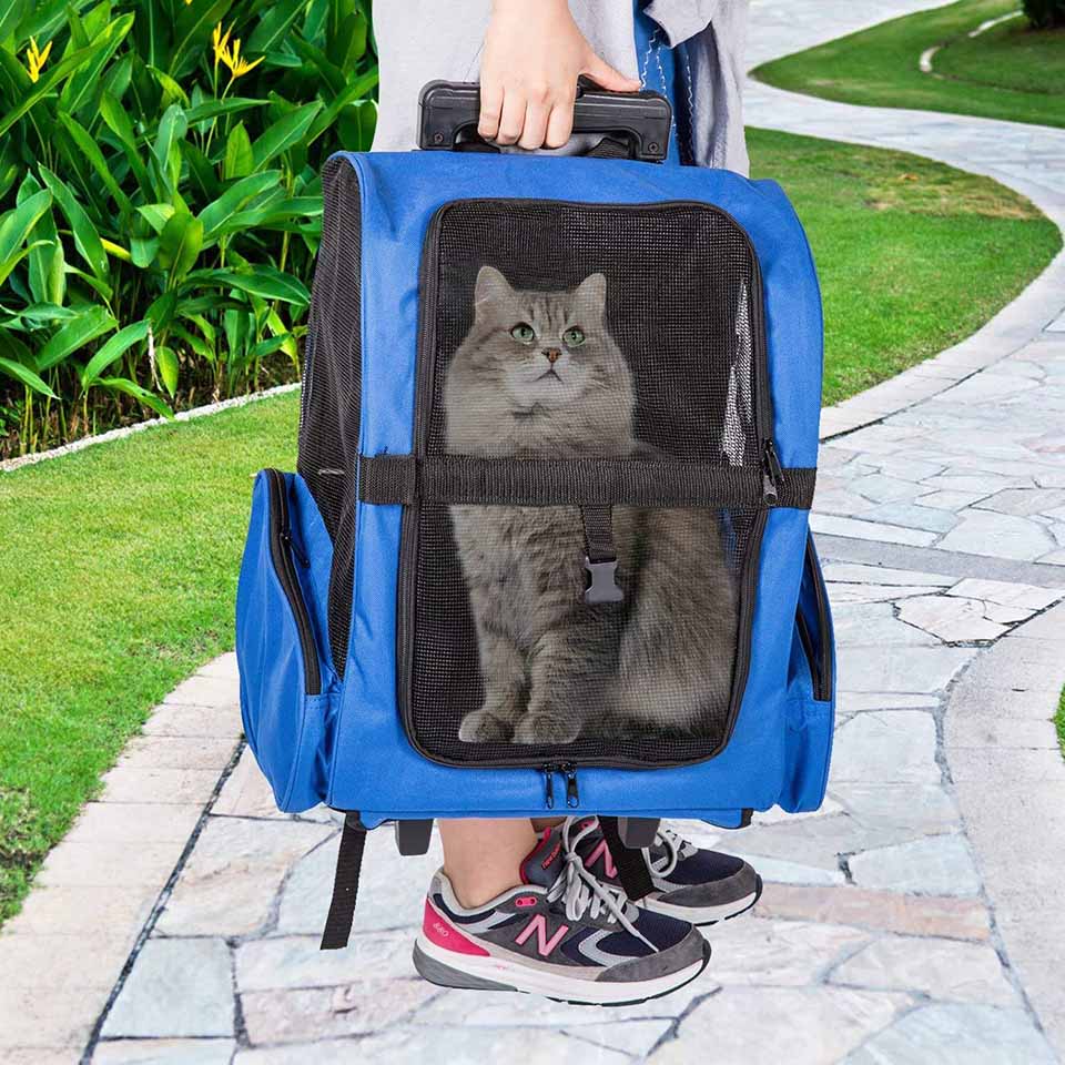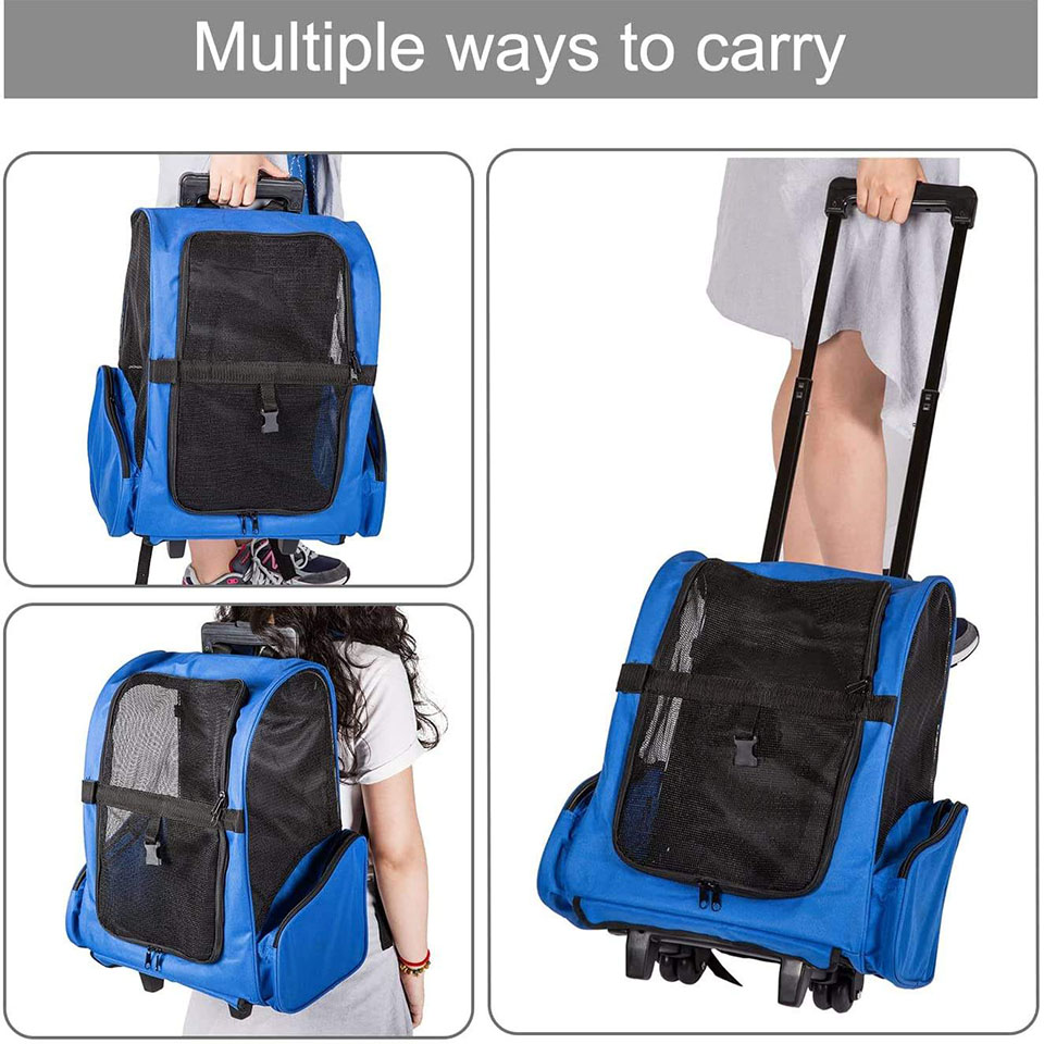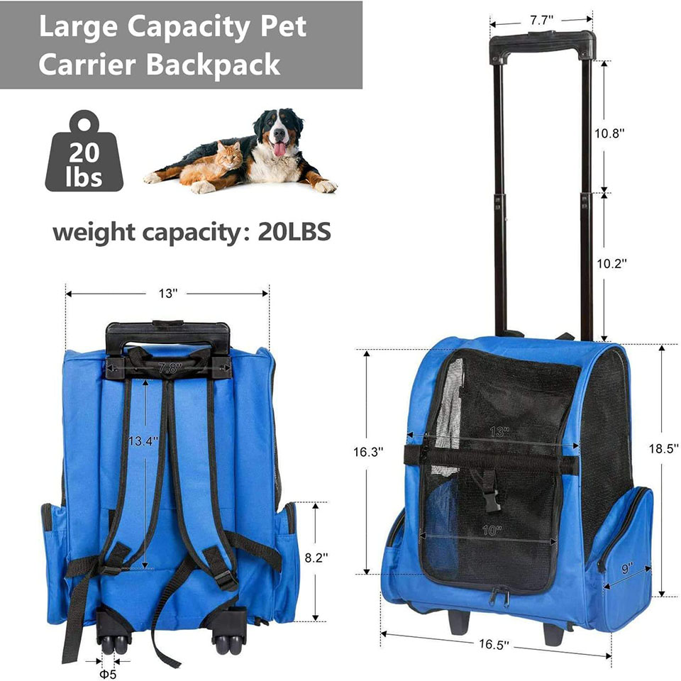 The pet carrier has telescoping handle with wheels, to function as a rolling case. Can be used as a backpack, tote, carrier, or car seat. Comes with removable plush pad for easy washing, tether to secure animal, and wheel cover. Provided your pet fits into the dimensions of the product comfortably when fully assembled, this item will support the weight of your pet. For small pets only - read sizing dimensions of product carefully.