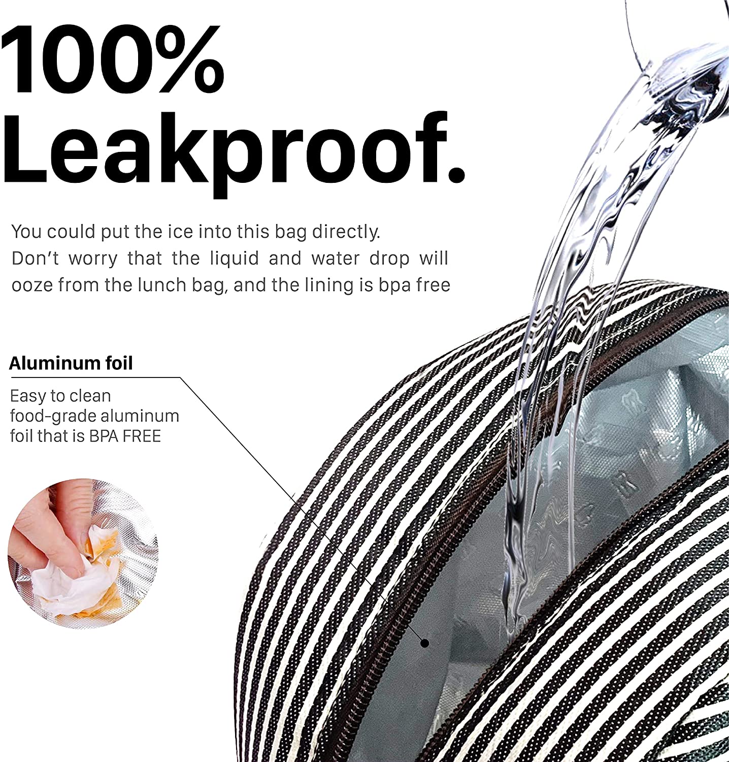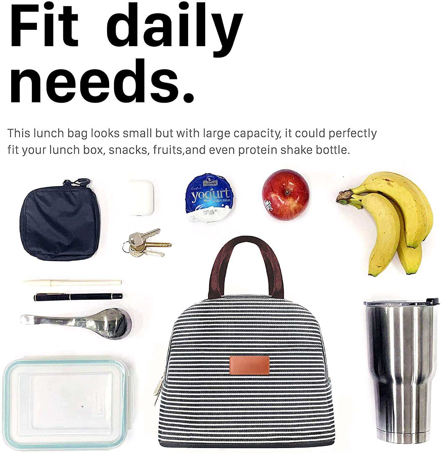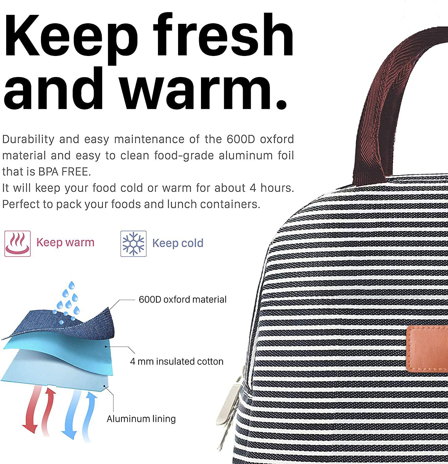 * [BALORAY LUNCH BAG]This lunch bag can be used as lunch bag, picnic bag, sundry bag, suitable for working women.Warm note: Traditional stitching process, so the inside insulated liner is water resistant, but not totally leakproof. * [Standard lunch bag Size]:10x 6.6x 8.5 inch.This lunch bag looks small but with large capacity, it could perfectly fit your lunch box, snacks, and even protein shake bottle.This is the honest feedback from our customers. *[ High Quality Material]:Durable oxford cloth and nontoxic aluminum foil( BPA FREE), perfect to pack your food and lunch containers.We have upgraded Insulation lined interior based on your needs. It will keep your food cold or warm for about 4 hours. ★THERMAL INSULATED: Lining with thick aluminum foil, interior padded with 5mm thicken insulation pearl foam, protect with 300d water resistant matte fabric, lunch box is designed with triple Insulated to keep food stay cold/warm/fresh for hours, perfect for on-the-go meals, picnics, road trips, lunch at the office, the school, the beach and more! ★SPACIOUS & MULTI COMPARTMENTS: Is designed for maximum storage efficiency, 1 main zipped compartment, 1 preposition velcro pocket, 1 practical zip pocket, not only provides you with plenty of space to pack all of your food and snacks you need whole day, as well as pack your keys, cards, phone chargers, napkins, water bottles, utensils, gum or other small stuffs you daily needs. ★THREE CARRYING OPTIONS: reusable lunch box features durable handle and comes with a removable and adjustable shoulder strap which can be adjusted from 18" to 28" when carrying, providing three options to carry: shoulder bag, oblique bag or fashion hand bag. Padded soft strap ensures comfortable carry. Wide opening design makes it convenient to fill and take food. Modern and lightweight design is convenient to be used as your lunch bag, cooler bag, picnic bag, sundry bag or shopping bag.