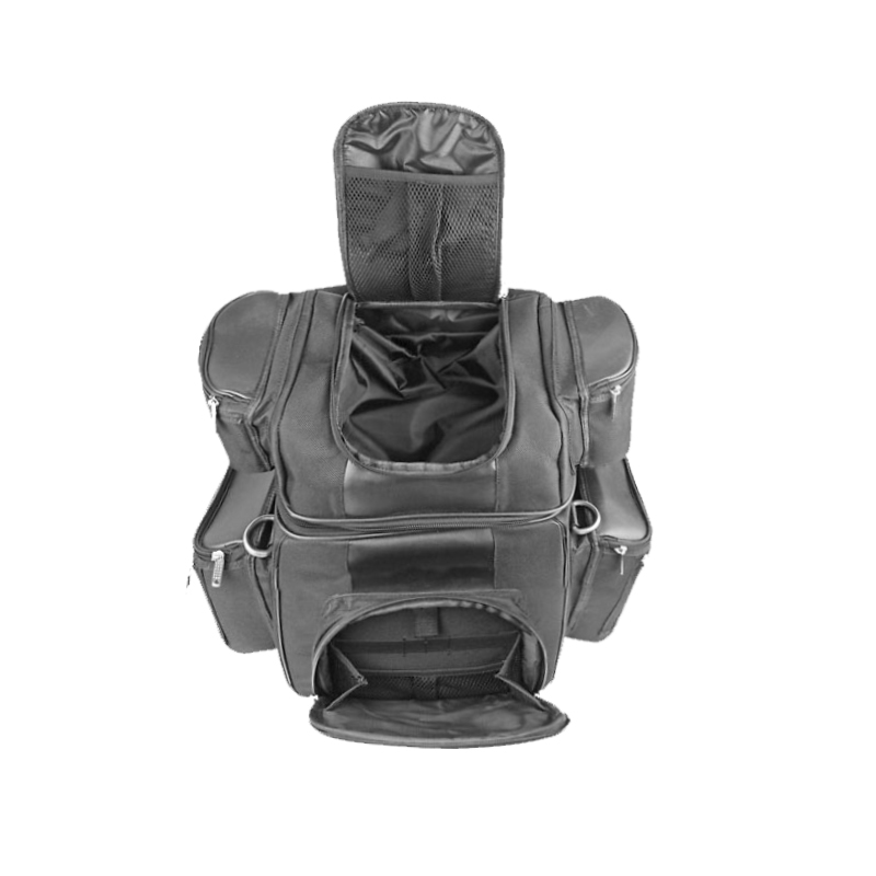 1. Spacious top-loading main compartment (11 inches deep) large enough to hold one full-face helmet plus other cargo. Includes additional a zippered mesh pocket and four pockets.