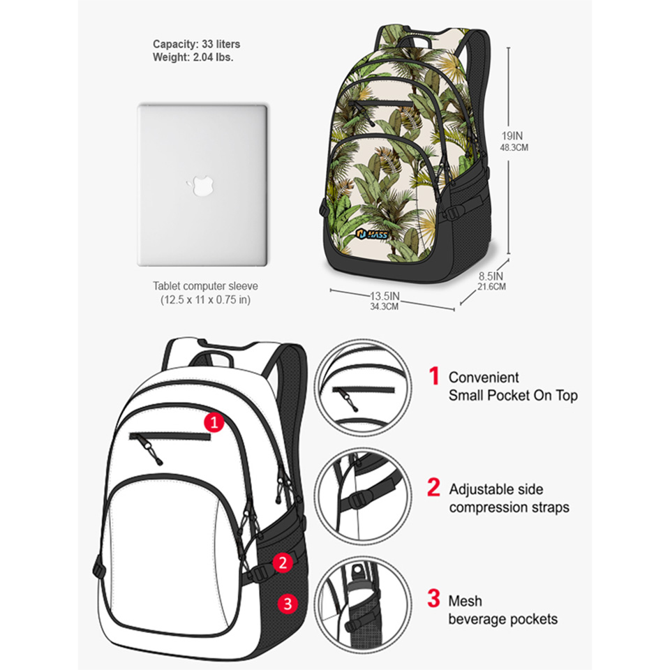 LARGE,MULTI-COMPARTMENT DESIGN Dimensions: 19 x 13.5 x 8.5inch Main compartment + secondary pockets with tablet sleeve Organization + 2 accessory pockets A dedicated sleeve for your tablet. Compression straps are designed to cinch down And secure gear while carrying. HIGH CAPACITY For School, Travel or Work Bookback with tablet sleeve PARTICULARS PRODUCT EXHIBITION |
