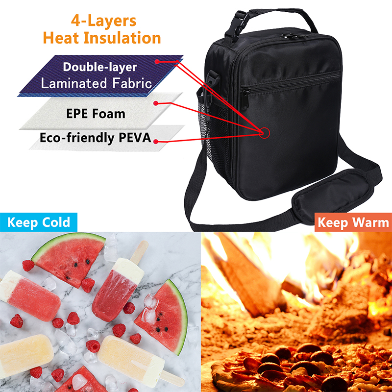 The top of the bag is made of PEVA material, for keeping your food fresh, suitable for fruits, snacks,drinks, etc The bottom of the bag is made of aluminum foil, for keeping your food warm, different temperatures can maintain 4-8 hours of insulation Size of lunch bag: 24 x 20 x14.5cm, the top of bag:20 x 14 x13cm, the bottom of bag:20 x 15 x 9cm , The length of shoulder strap is adjustable(MIN:29cm, MAX:55cm) The bag is convenient to carry to school, work, picnic, camping,fishing trip etc. Several pockets on front and back for something needed,like phone,tableware, transportation card,earphone,etc Made of high quality and strong oxford cloth, the bag is suitable for hand wash in cold water, NOTE:don't wash in hot water or machine wash