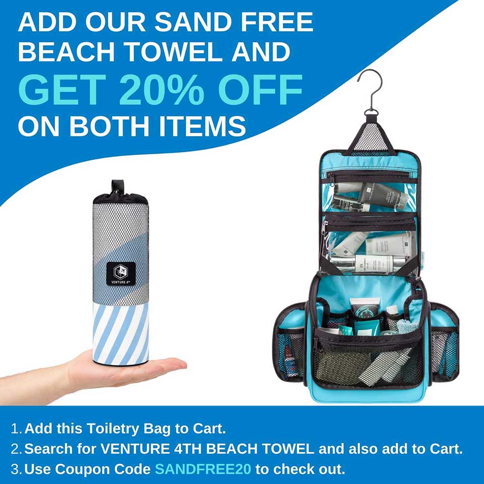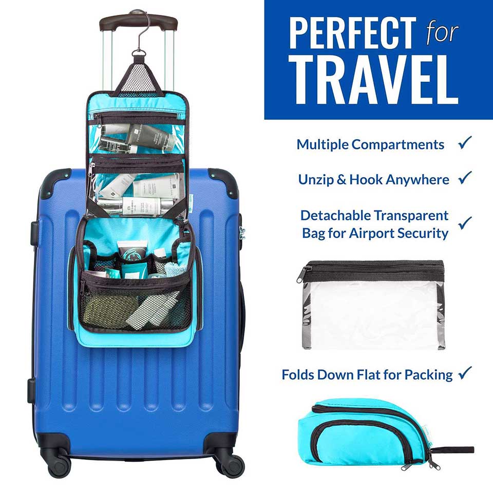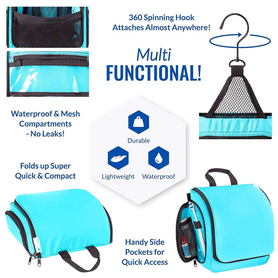 * ✈️ Unisex Hanging Toiletry, Makeup and Wash Bag. This travel bag has numerous pockets, strong zippers, dual side "wings", elastic holders and mesh pouches to store all travel toiletries, cosmetics and make-up in one portable, water-resistant bag. * ✈️ Organize your Travel Toiletries: This travel wash bag is compact yet large enough to carry all travel essentials upright. Perfect for individual, couple or family use. Side pockets with extra elastic loops and mesh bags for makeup, toothbrush and small travel items. Sturdy bottom assures your travel cosmetic bag remains upright and does not tip over on bathroom ledge or basin. * ✈️ Strong Metal Swivel Hook (360 degrees): The sturdy hook is large enough to hang your travel toiletry kit or wash bag from any hook, door, rod, basin or even a tree when camping. Easier than a shaving Dopp kit as toiletries are easily accessible and visible when hanging. A perfect travel toiletry bag and organizer. * ✈️ Extra Travel Savvy Bonuses: Included with the travel toiletry bag is a removable clear transparent travel TSA compliant zipper bag for tour travel essentials such a toothbrush, make-up, meds or wipes. Simply place in hand luggage for easy airport security checks and attach to toiletry bag at destination. The travel toiletry bag also comes in a versatile water-resistant drawstring bag perfect for wet items or shoes. |