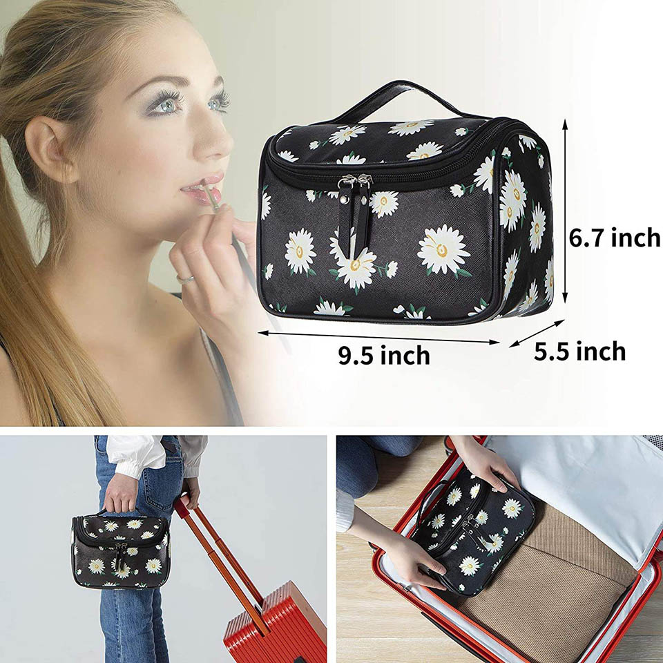 \uD83D\uDC5B PERFECT FOR TRAVEL:Size 9.1"*5.5"*7.1",7 ounces weight,decent size without any bulkiness.Our makeup bag have enough space to storage your travel essentials.like makeup mirror,lipstick, lip gloss, eyeshadow, makeup palettes, hairbrushes, nail polish organizer,etc.